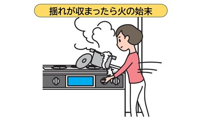 地震で揺れている最中に火を消しに行くと、鍋やヤカンが転倒したり落下してくる可能性があり、中身を浴びて大火傷する危険があります。揺れが収まってから、落ち着いて対処しましょう。