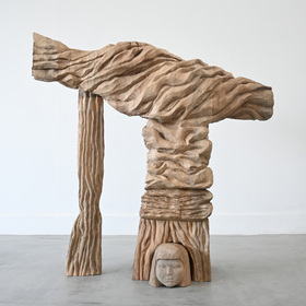 布をかぶることにより消える自己性があると考えている。人と同じ見た目になることによって安心感をおぼえ、それを脱ぐことを躊躇し更に抑圧され身動きが取れなくなっている。この作品は雑巾を絞ったような大雨の日に室内に籠っている自刻像だ。雨が降ると外の音は雨の音でかき消され自分だけの空間が作られる。晴れた日には外に出ることを促されるがこの時は籠ることを許されている感覚がある。一時的な安全地帯を手に入れても止んだらまた外に出なくてはならないことを分かっていて様子を伺っている。
