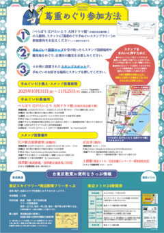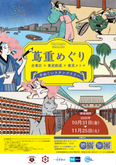 大河ドラマ「べらぼう~蔦重栄華乃夢噺~」の主人公・蔦屋重三郎ゆかりの地の台東区で、『蔦重めぐり ~台東区×東武鉄道×東京メトロ 手ぬぐいスタンプラリー~』を開催します。「べらぼう 江戸たいとう 大河ドラマ館」をスタートし、蔦屋重三郎ゆかりの地などを巡りながら、各所に設置されたスタンプを手ぬぐいに押し、オリジナルの手ぬぐいを完成させていくイベントです。ぜひご参加ください。