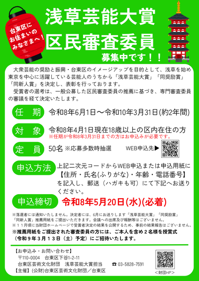 浅草芸能大賞では、受賞候補者を推薦する区民審査委員を募集しています!