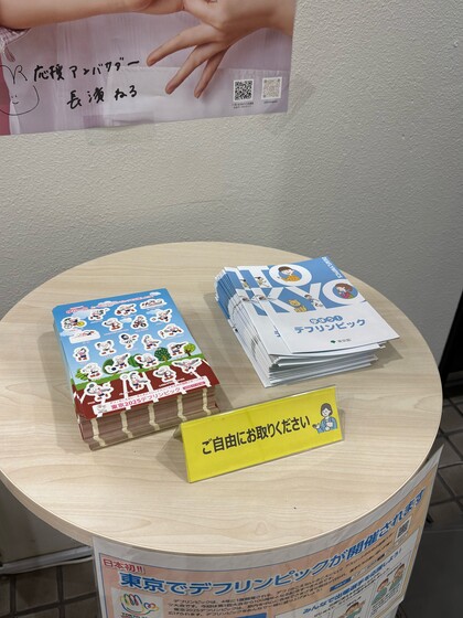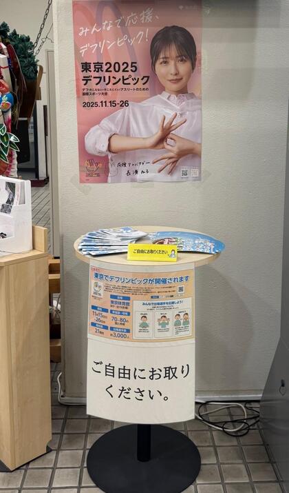 啓発コーナーでは、「東京2025デフリンピック大会公式ポスター」や応援に使える手話のご案内を掲示しています。