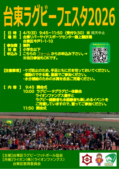 台東区ラグビーフットボール協会主催の「台東ラグビーフェスタ2026」が今年も開催されます!