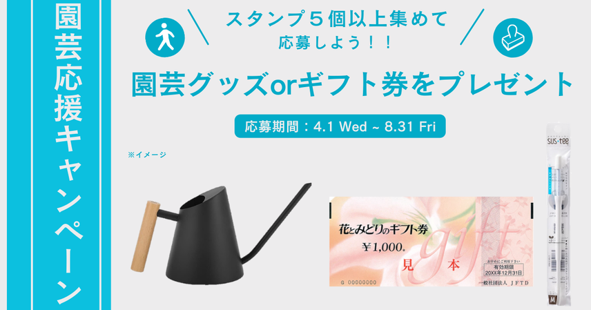 スタンプを5個以上獲得した方から抽選で、園芸店で使用できるギフト券や、園芸グッズをプレゼント!!