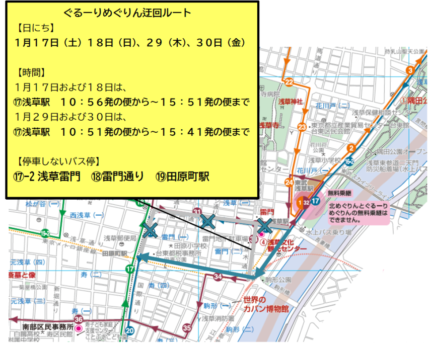 雷門通りの通行止めに伴うめぐりんの迂回について(1月17日~18日、29日~30日)