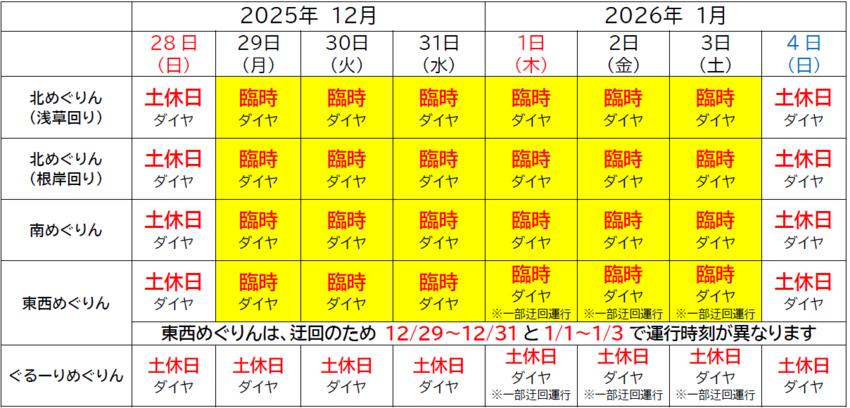 また、1月1日(木曜日・祝日)から1月3日(土曜日)は、浅草寺初詣に伴い交通規制があるため、「東西めぐりん」と「ぐるーりめぐりん」において迂回運行を実施します。