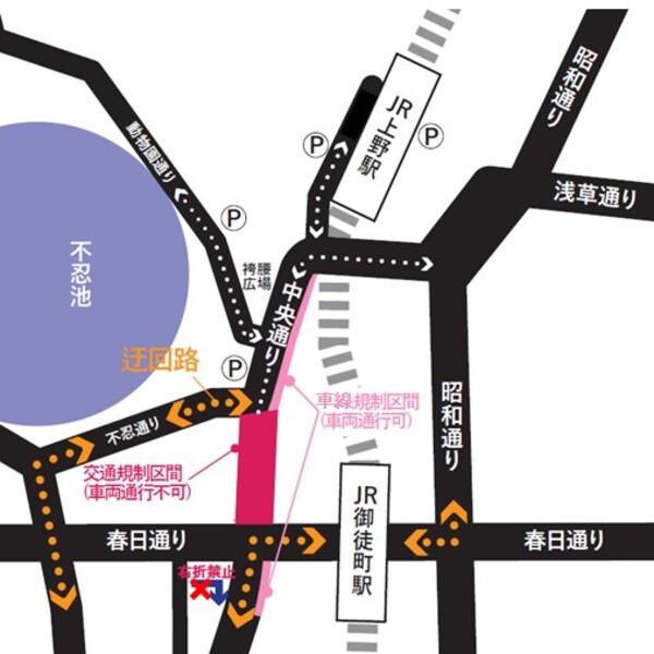 中央通りの一部区間(上野公園前交差点から上野広小路交差点まで)及び袴腰広場