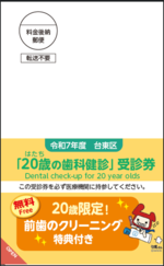 問診・口腔内診査・保健指導・前歯のクリーニング【20歳限定】、さらに受診者には後日台東区よりプレゼントをお送りします!