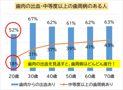 台東区の歯科基本健康診査の結果でも、20歳の約5人に1人は進行した歯周病です。初期症状である歯肉の出血がある人は半数以上にもなります。この初期症状を見逃さないことで歯周病の進行を食い止めることができます。