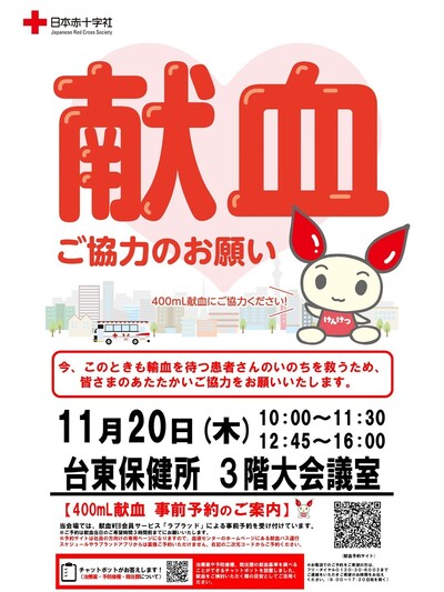 台東区では、台東区役所正面玄関前、生涯学習センター駐輪場 及び 台東保健所で東京都赤十字血液センターによる献血活動を実施しています。