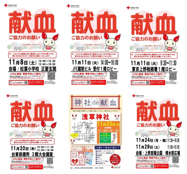 ※予定が変更される場合もありますので、東京都赤十字血液センター 献血バス運行スケジュールでご確認ください。