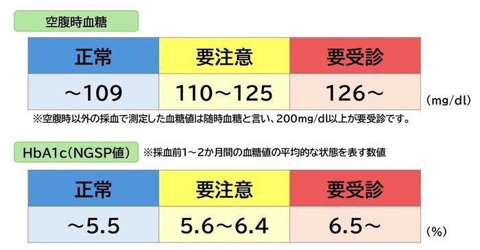 健康診断では、原則として空腹時の採血で測定した血糖値(空腹時血糖)、またはHbA1c(ヘモグロビンエーワンシー)の値で判定しています。