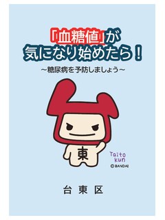 台東区のオリジナルリーフレット「血糖値が気になり始めたら!」を作成し、保健所の窓口等で配布をしています。糖尿病に関する基礎知識や予防方法、区のサービス等を紹介しています。ご希望の方は、下記担当までお気軽にお問合せください。