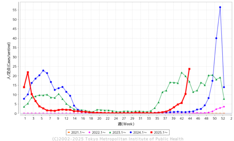 第43週(10月20日から10月26日まで)の都内のインフルエンザ定点医療機関からの患者報告数が10.37となり、都の注意報基準を超えました。