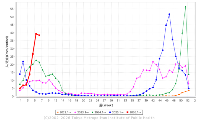 都内のインフルエンザ定点医療機関からの1月26日から2月1日(第5週)の患者報告数が再度都の警報基準を超えました。