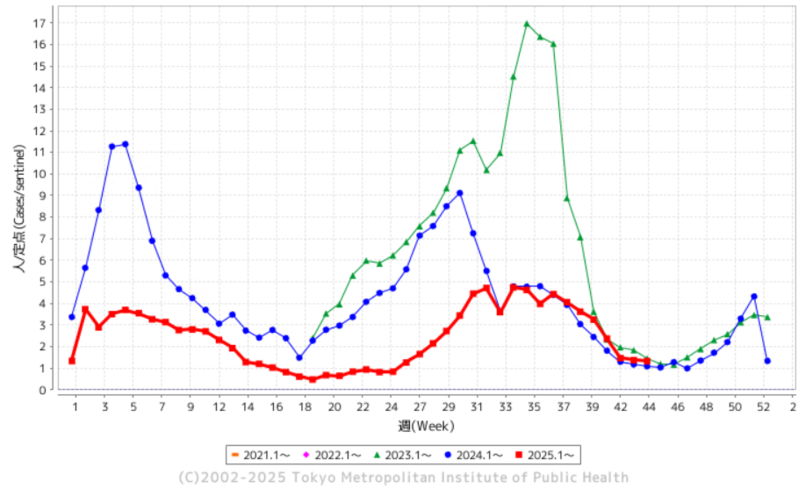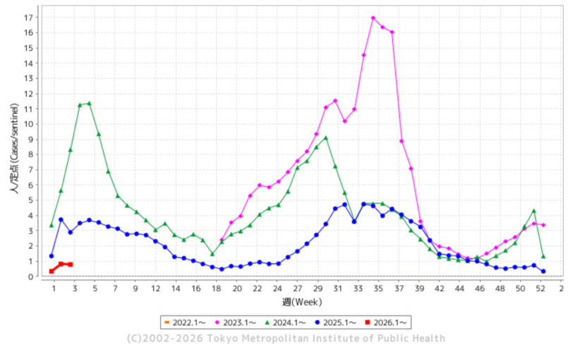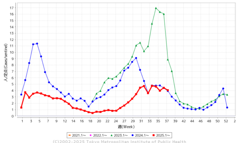 全国的に患者報告数が増加しています。直近で過去4年間を大きく上回っており、引き続き注意が必要です。