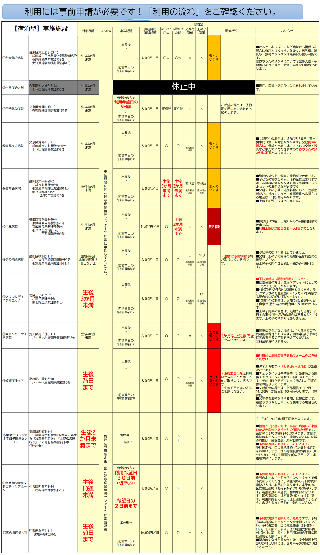 ・東京かつしか赤十字母子医療センター宿泊型の利用申込は施設のホームページからの申請となります。予約後、区に電話連絡をお願いします。一覧表をご確認ください。