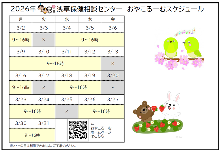 *健診等によりご利用できない日時があります。詳しくは、各月のスケジュールをご確認ください。