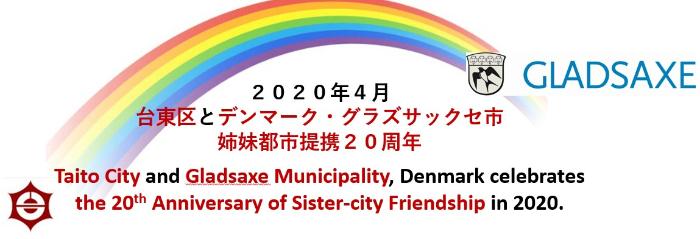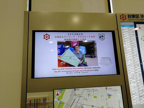 台東区とグラズサックセ市の姉妹都市提携20周年を記念して、台東区役所と生涯学習センターに設置された「区政情報モニター」で祝賀放映しています。祝賀放映ではグラズサックセ市長 トリーネ・グレーゼ氏が「パトナーシップ、絆」という意味のデンマーク語≪Partner skaber≫と書かれたボードを掲げています。