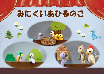 みにくいといじめられたひなが旅に出て、本当の自分や仲間をみつける物語。