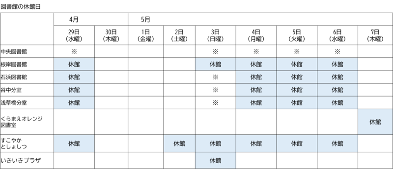 石浜図書館 4/20~4/23 4/26~4/30 5/8