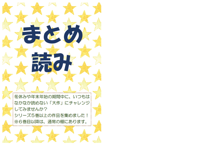 冬休みや年末年始の期間中に、いつもはなかなか読めない「大作」にチャレンジしてみませんか?シリーズ5巻以上の作品を集めました!※6巻目以降は、通常の棚にあります。